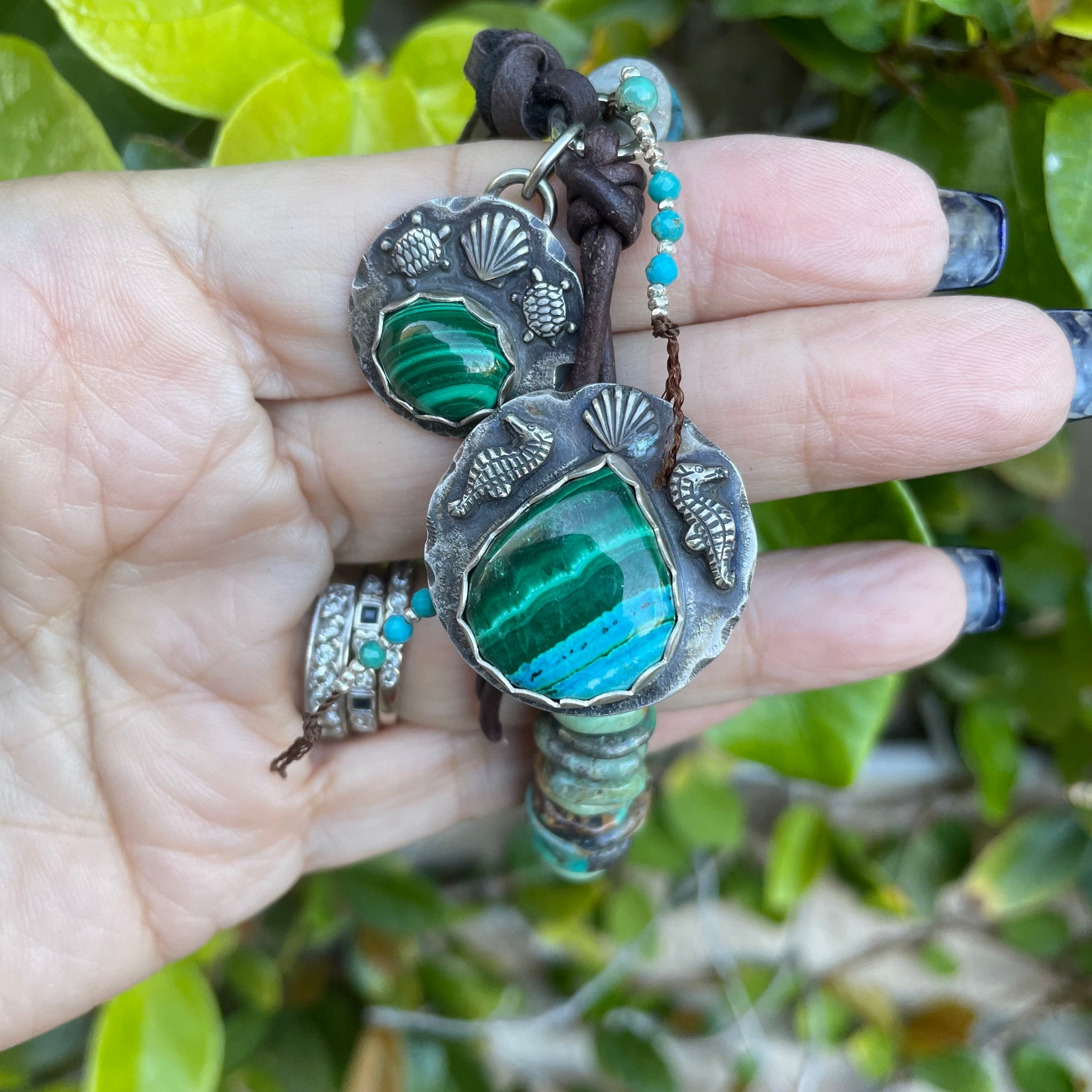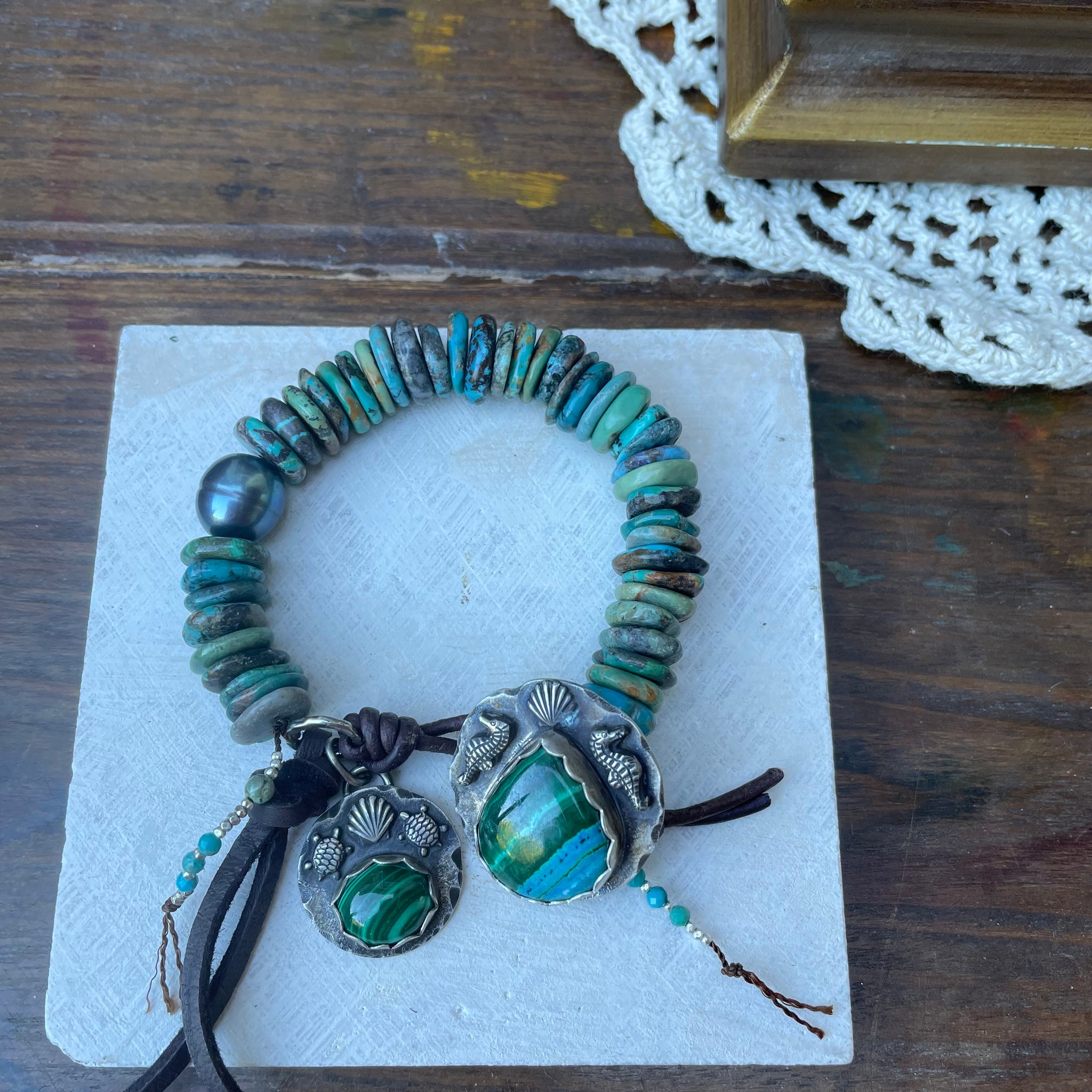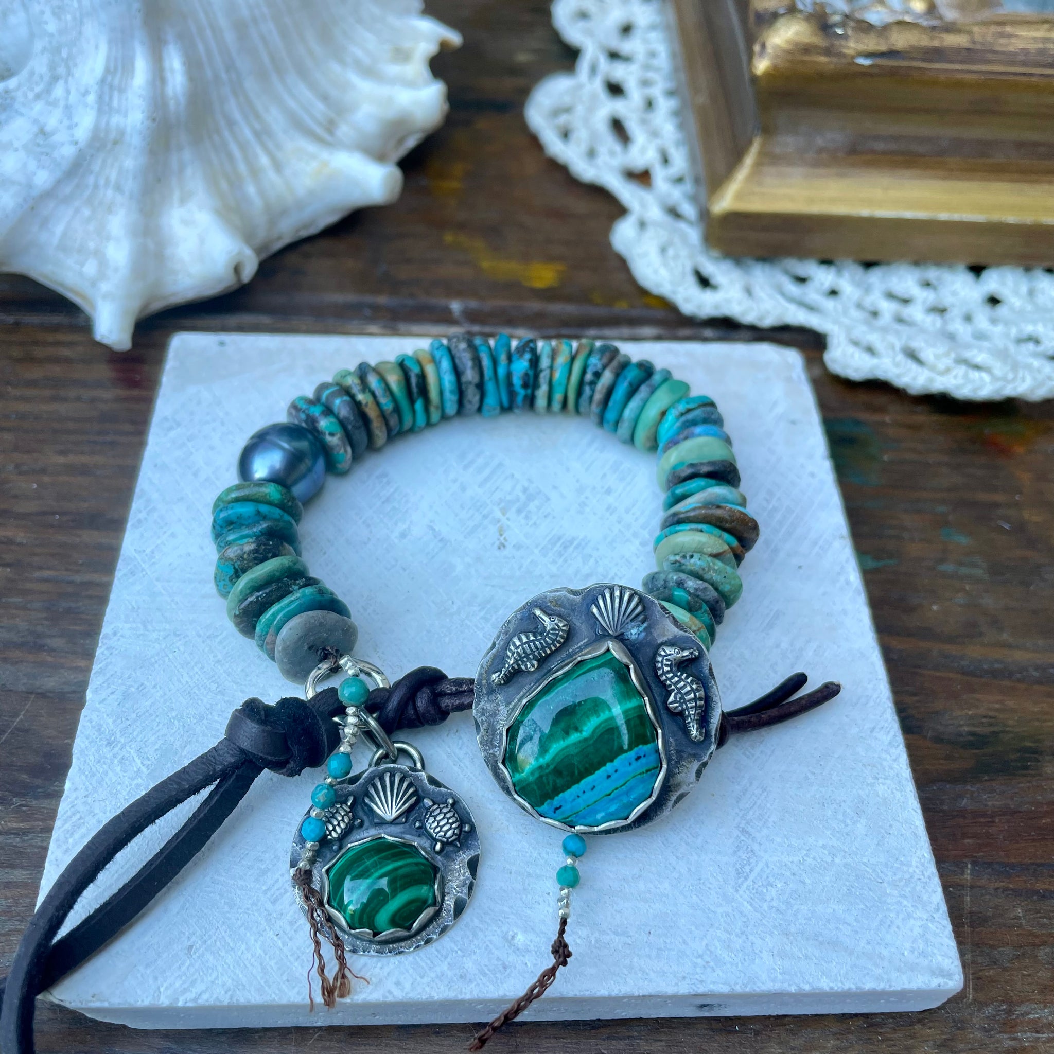 This one of a kind bracelet has been created with chunky, handcut turquoise heishi beads, a single Edison pearl, with a beautiful artisan handmade malachite and Chrysocolla button and malachite charm. Each detailed ocean component has been made by hand by a very talented smith. She created and sawed out the sea turtles and seahorses for these embellishments. It has been completed with the fabulous custom artisan sterling button as the secure closure, dangling handmade sterling charm, along with buttery soft leather. Created to fit a 6.25-7.25” wrist.