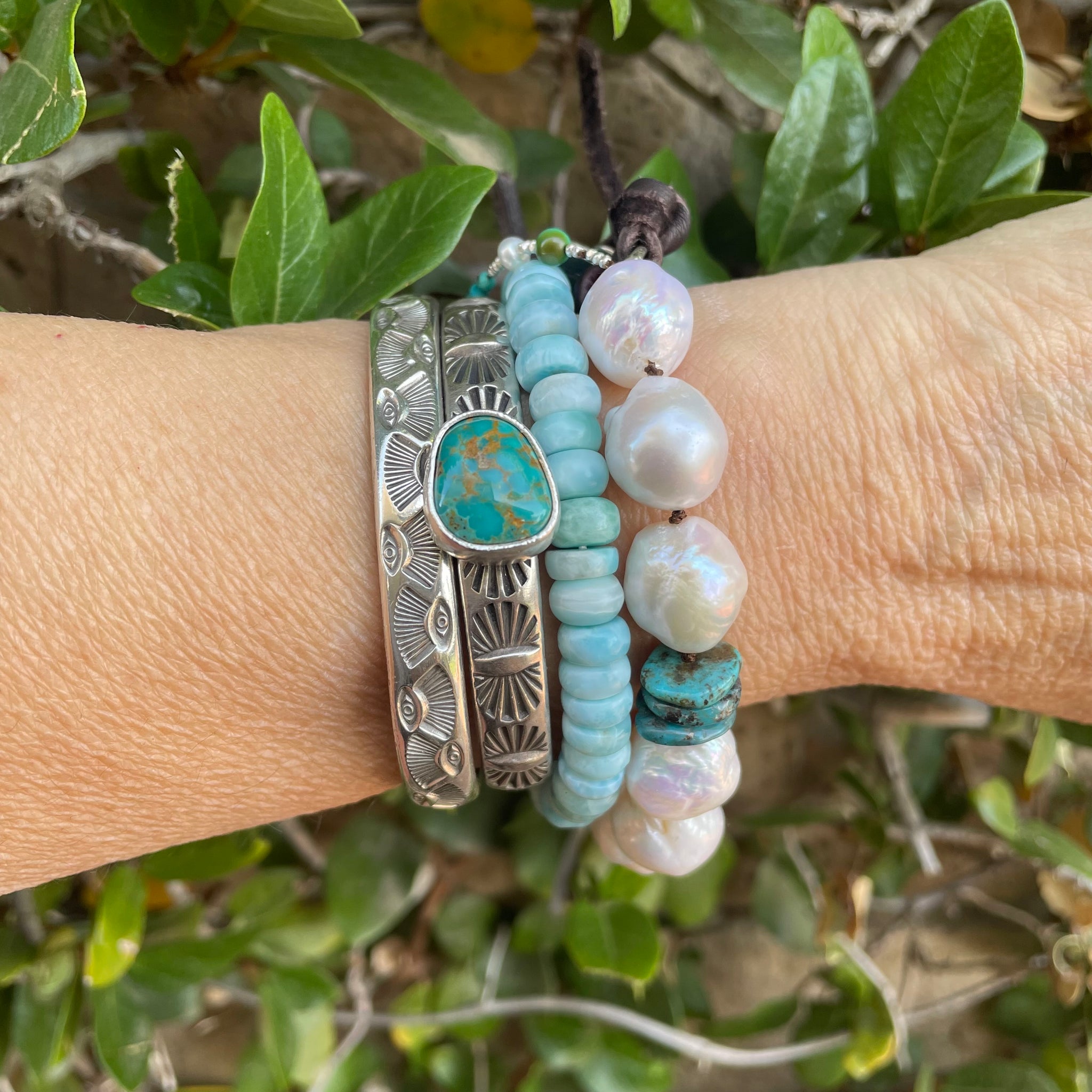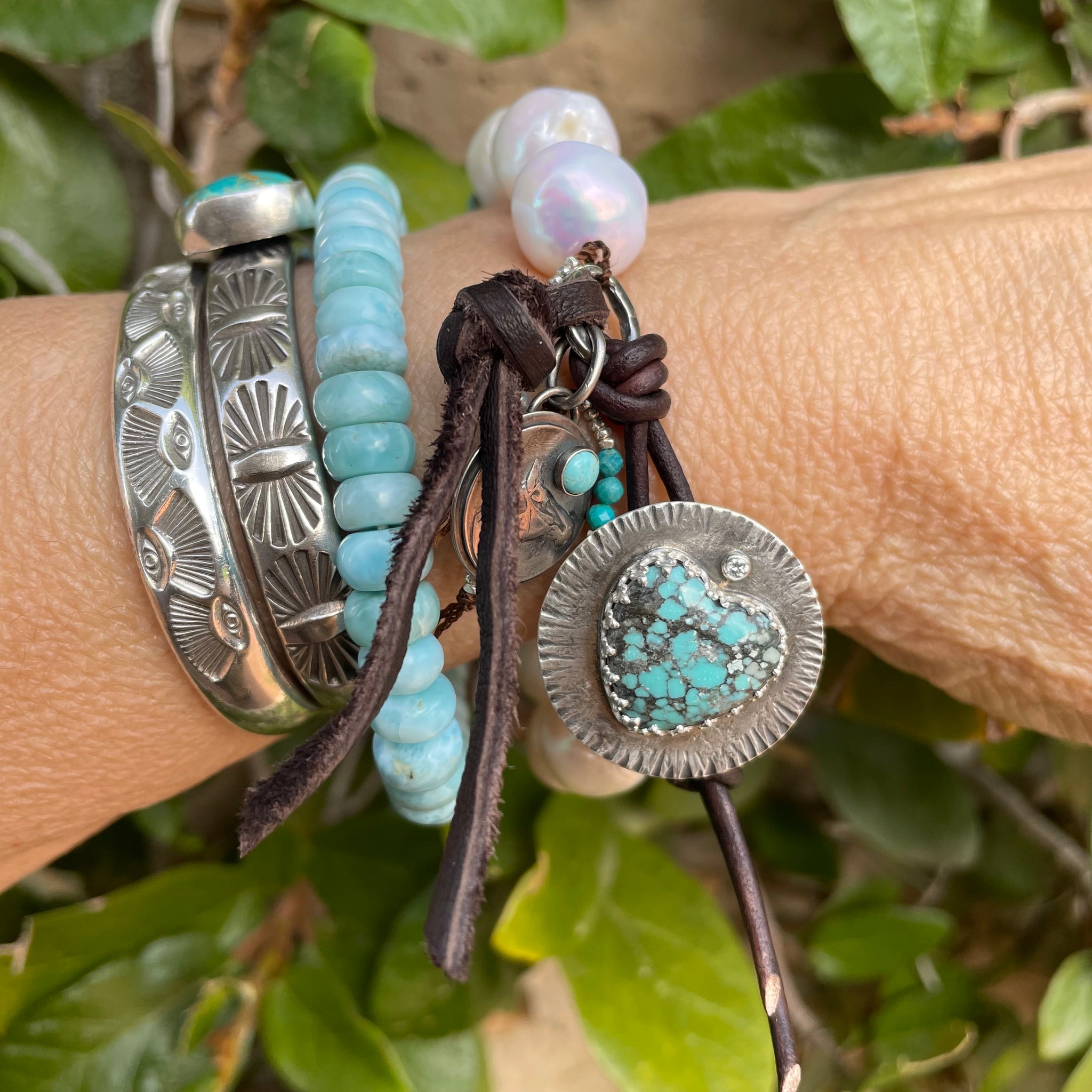 This one of a kind bracelet has been created with crazy beautiful large white Edison pearls with Aurora luster and three handcut turquoise beads. It has been completed with the fabulous custom artisan sterling textured button featuring a lovely turquoise heart and sparkling little diamond, as the secure closure, dangling sterling and turquoise horse head charm, turquoise and sterling beaded fringe along with buttery soft leather. Made to fit a fairly average sized wrist, this one is a gorgeous statement of a pearl bracelet. There won’t be another like it!!!!!!