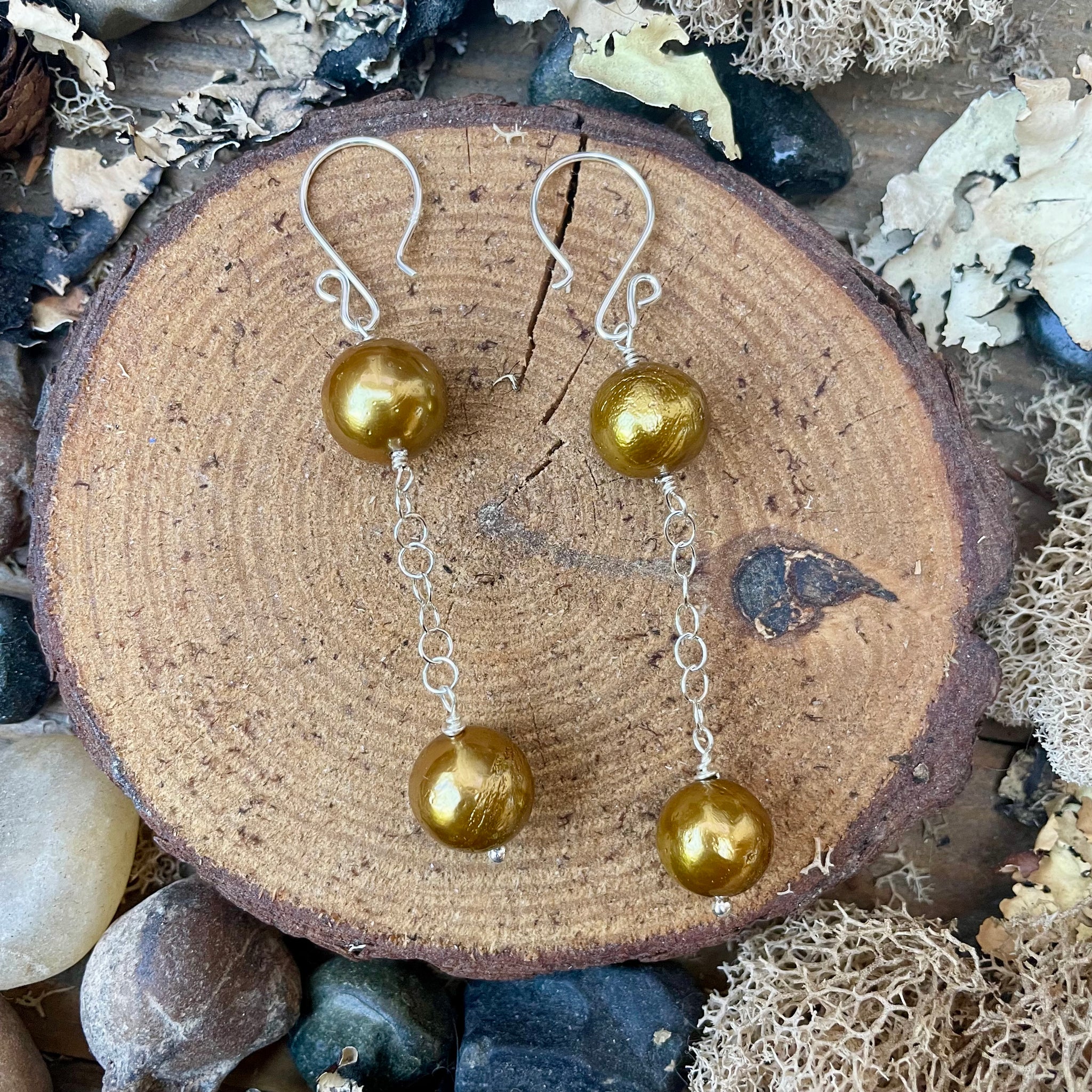 These dangle earrings have been created with super luminous gold bronze Edison pearls, and sterling components dangling from awesome sterling silver hooks. They are lightweight, crazy comfy, classic and would make a fantastic gift!