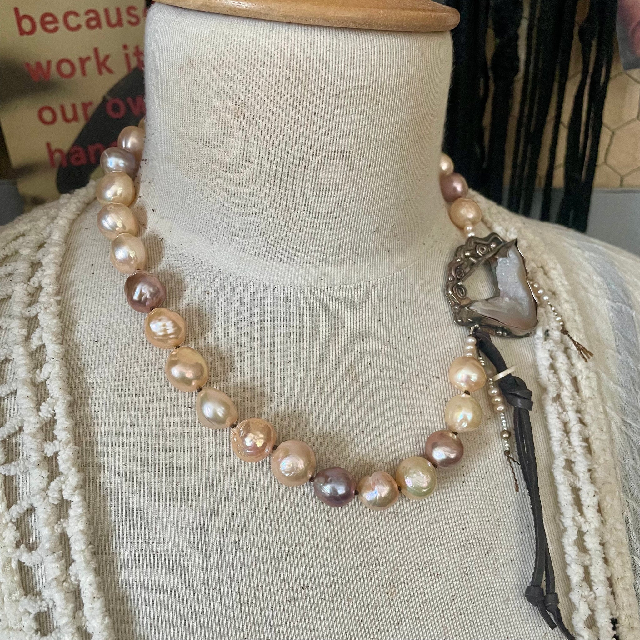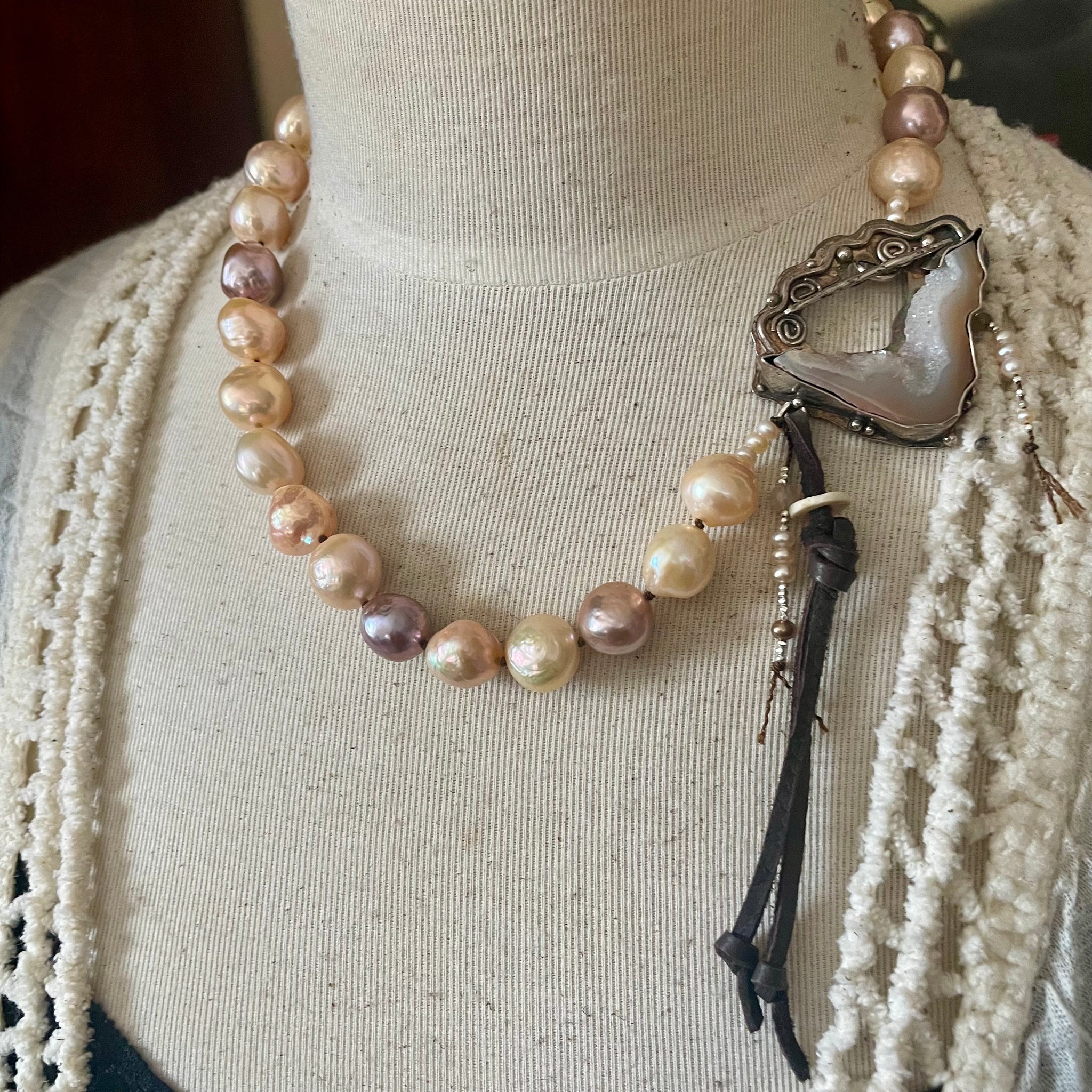 This totally unique single strand necklace has been created with super luminous metallic, natural candy Edison pearls knotted between each, connected by a secure large artisan made Geode set in sterling silver with dangling sterling beads with leather. I have added these tiny sterling dangles with gems and pearls to gracefully lay besides the beautiful toggle clasp. Totally one of a kind!!!