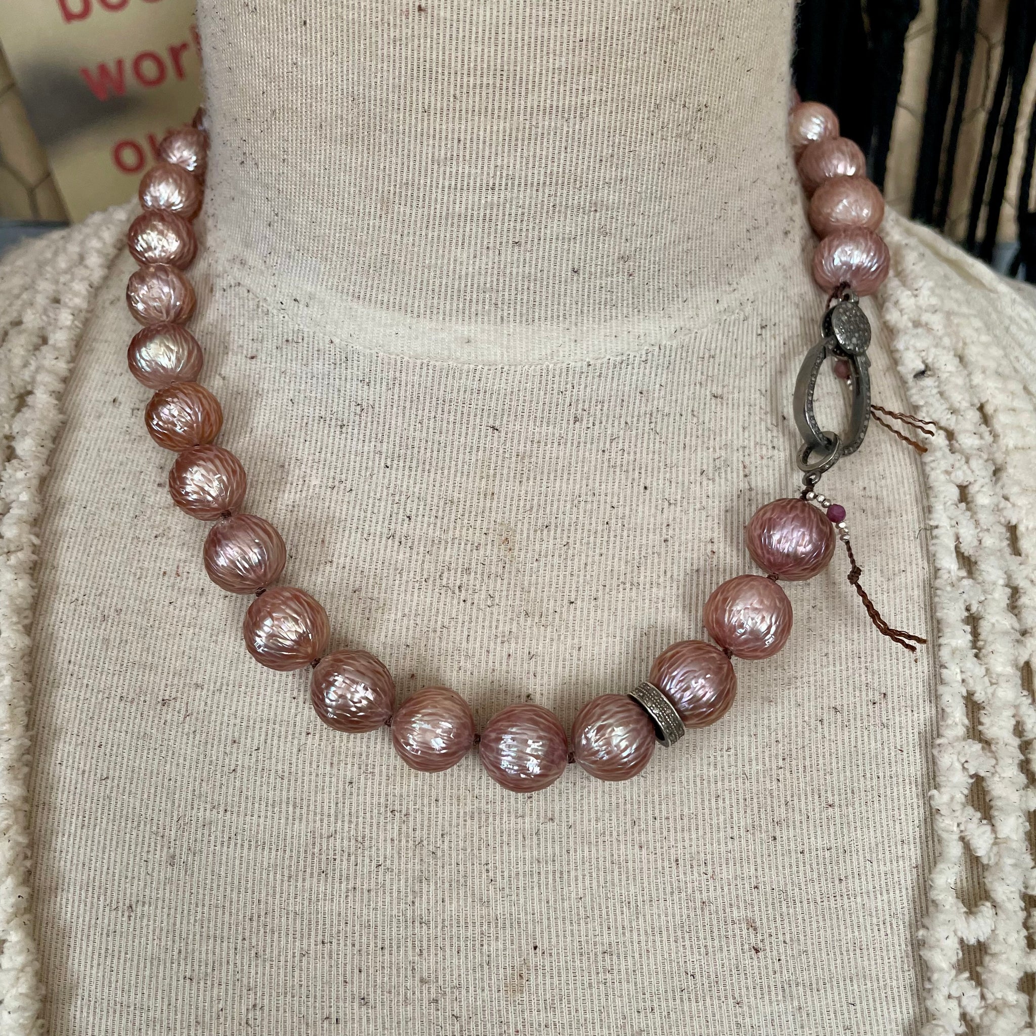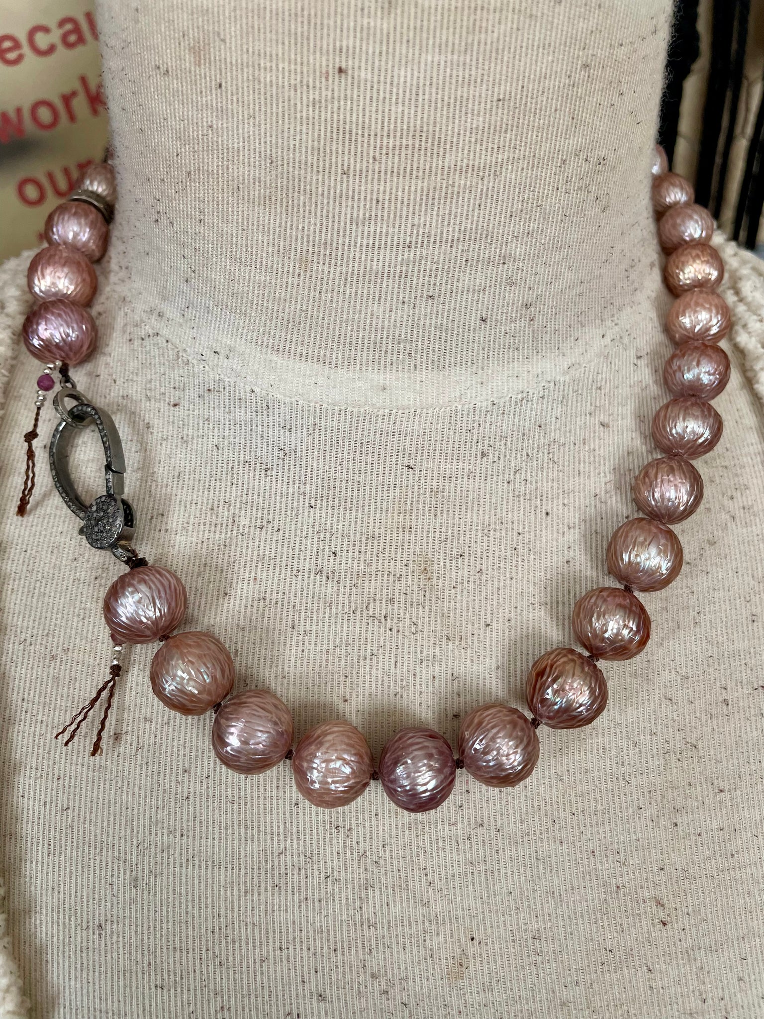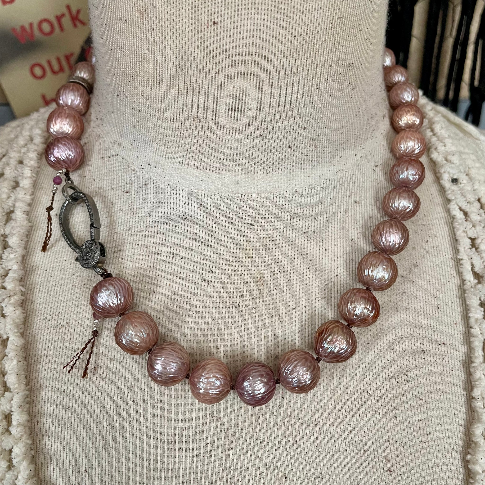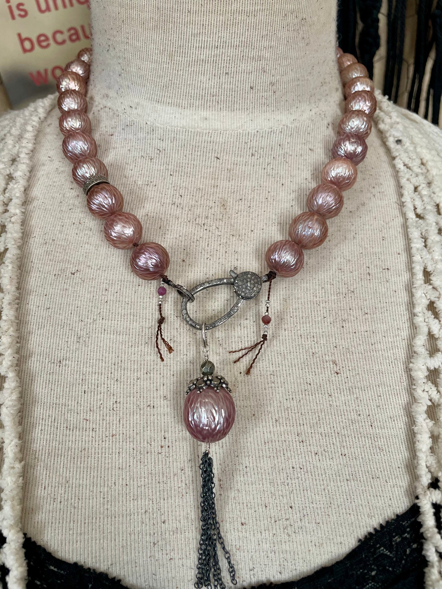 Have you heard chunky jewelry is the trend for 2025? This one of a kind chunky single strand necklace has been created with large high end, super luminous, Dragon Scale carved Edison pearls knotted between each, with a double layered Pave Diamond spacer flanked by tiny sterling silver beads, pearls, and fringe connected to a secure Pave Diamond lobster closure and sterling beads. These pearls are certainly a statement! Absolutely stunning strand that has a luxurious appearance. The clasp can be worn on the side or in back as shown, and with or without the pearl and sterling silver chain tassel.