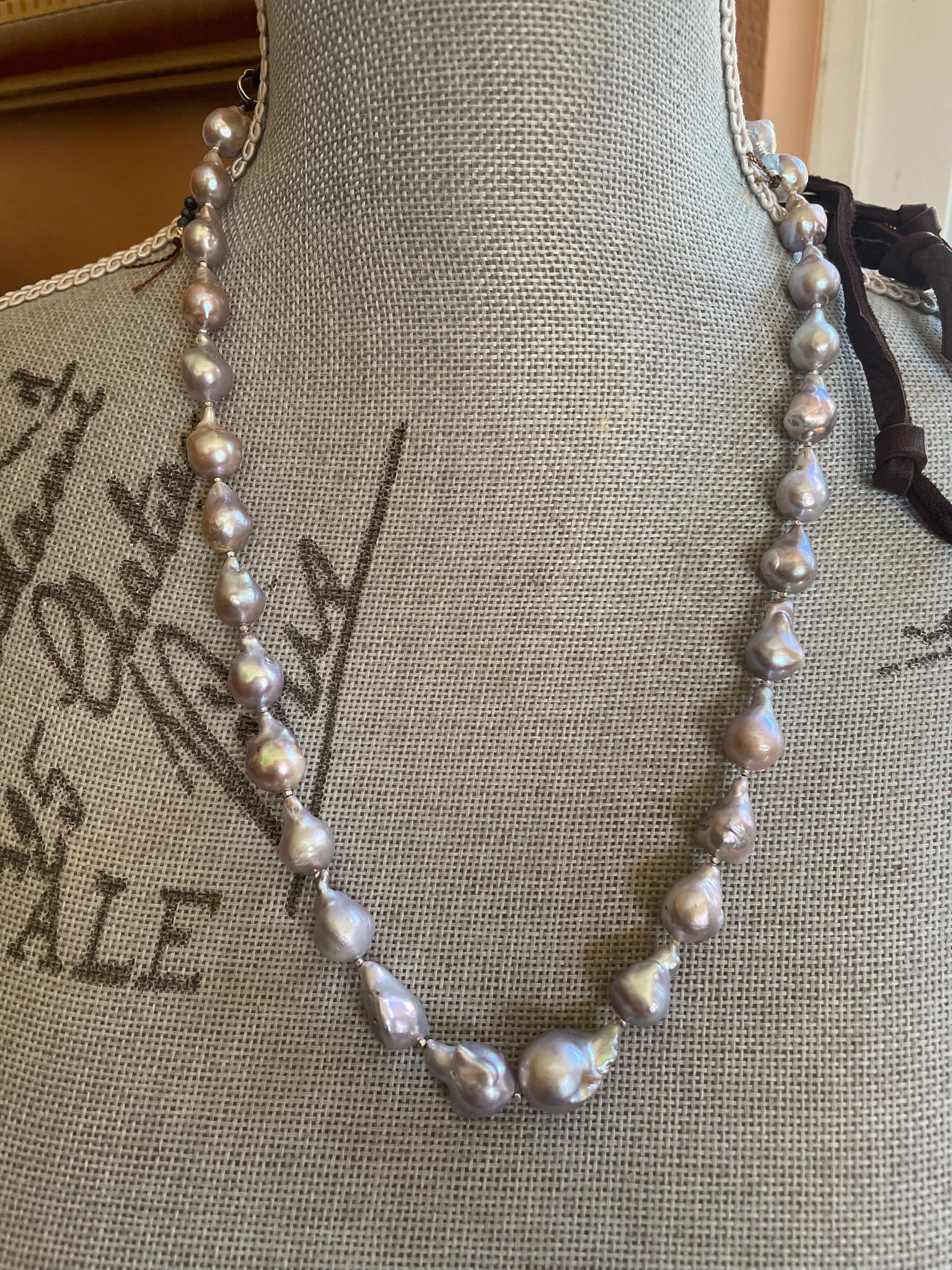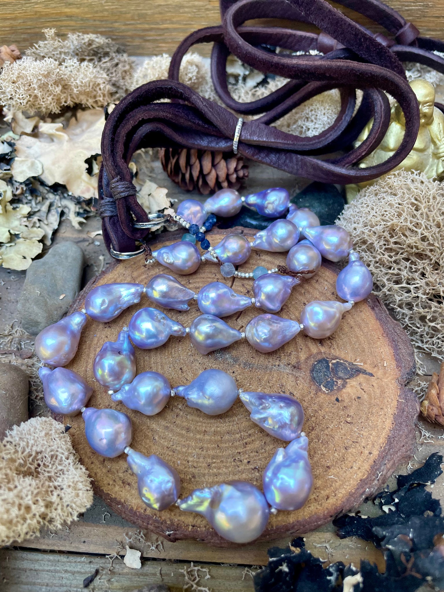 This single strand necklace has been made with super luminous silver blue teardrop Edison pearls flanked by tiny sterling silver beads, Sapphire and Aqua gems and pearls, connected to artisan sterling links with a buttery brown leather neckline. These pearls are full of shine and personality! If you haven’t yet worn a leather neckline, they are breathable and so comfy! This is a one of a kind necklace and is so easy to wear and pair with other pieces. It looks great solo, can be worn at various lengths or can be layered anyway you desire, including short at 19” or long at 34”. You can easily add a big bale pendant if you wish.
