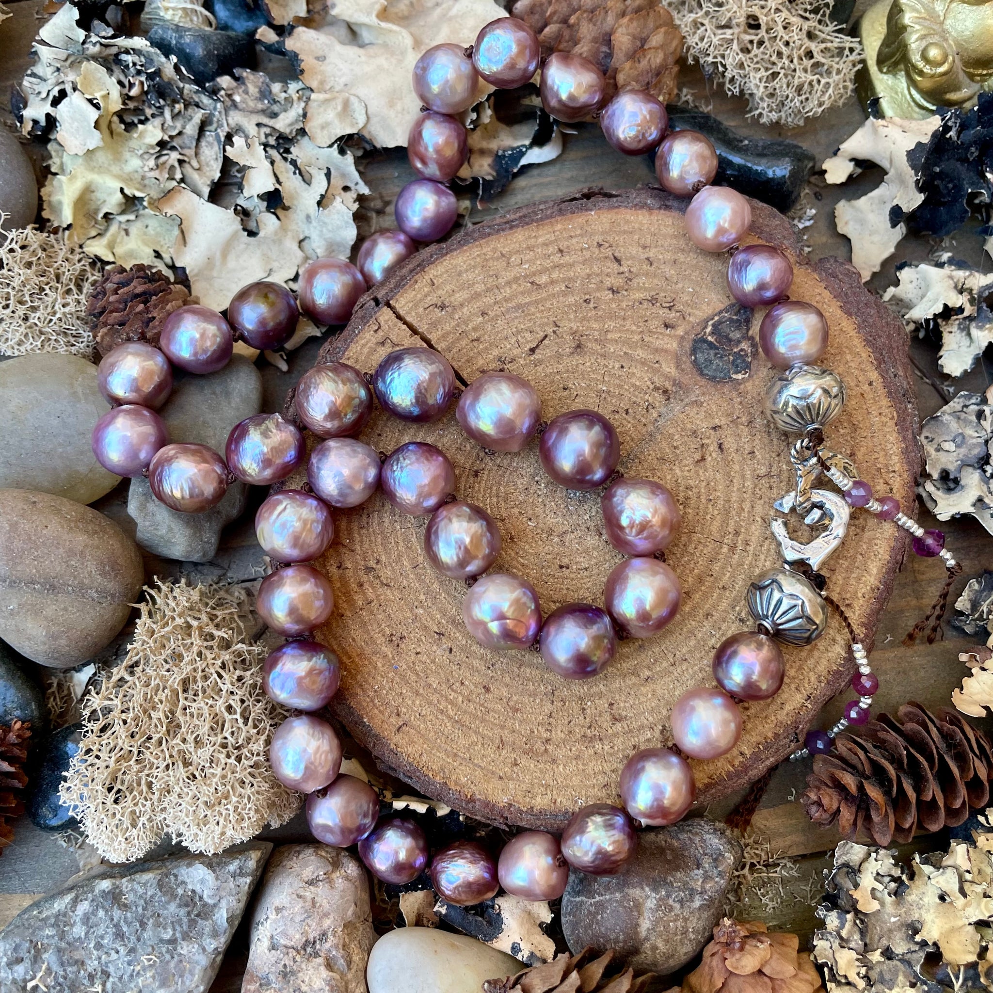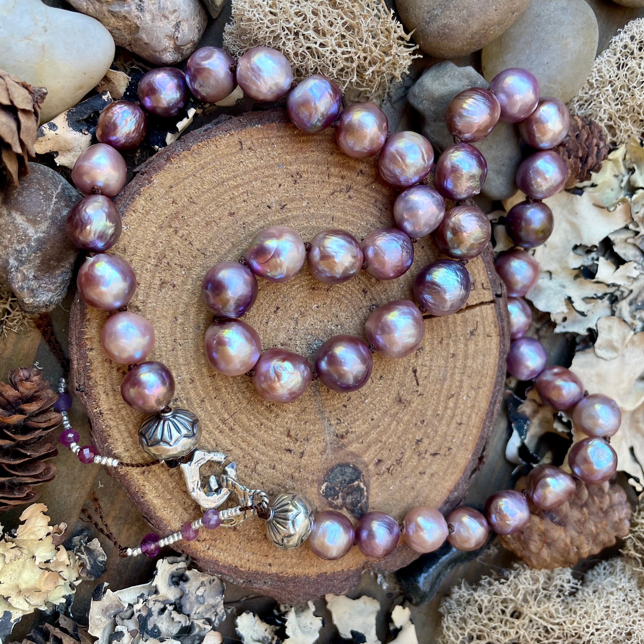 This single strand necklace has been created with super luminous natural purple Edison pearls flanked by tiny sterling silver beads, tourmaline and ruby fringe, connected to an artisan silver C clasp closure. These lovely Edisons are rich natural purple with crazy luster. This piece can be worn with the clasp on the side or clasp in back. It’s a one of a kind necklace and is so easy to wear and pair with other pieces. It looks great solo and hangs at about 18”.