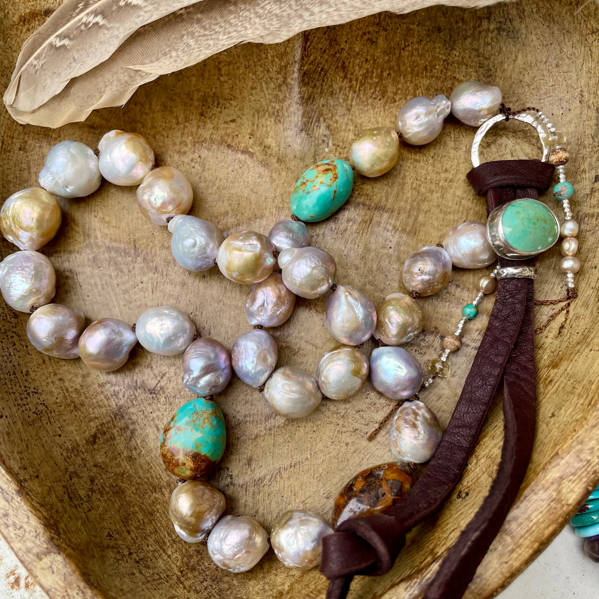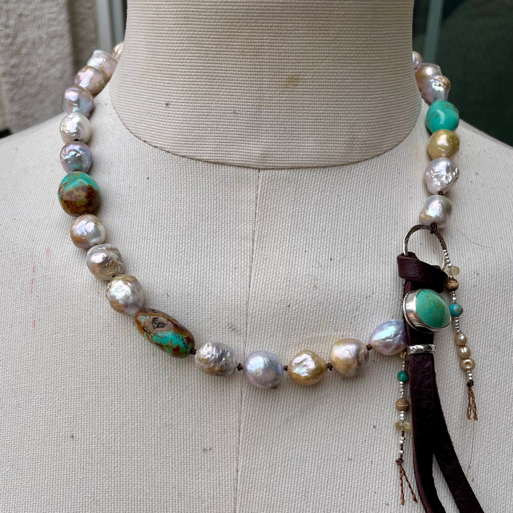 This totally unique single strand necklace has been created with super luminous metallic, natural Edison pearls knotted between each, with three high end Turquoise nuggets, connected by a secure artisan sterling silver Carlin Turquoise button and leather. Petite sterling beads along with pearls, gems and turquoise create a fringe which hangs gracefully from the side of the button clasp. The brown leather has been knotted at the ends, to allow the tendrils to hang freely. Totally one of a kind!!!