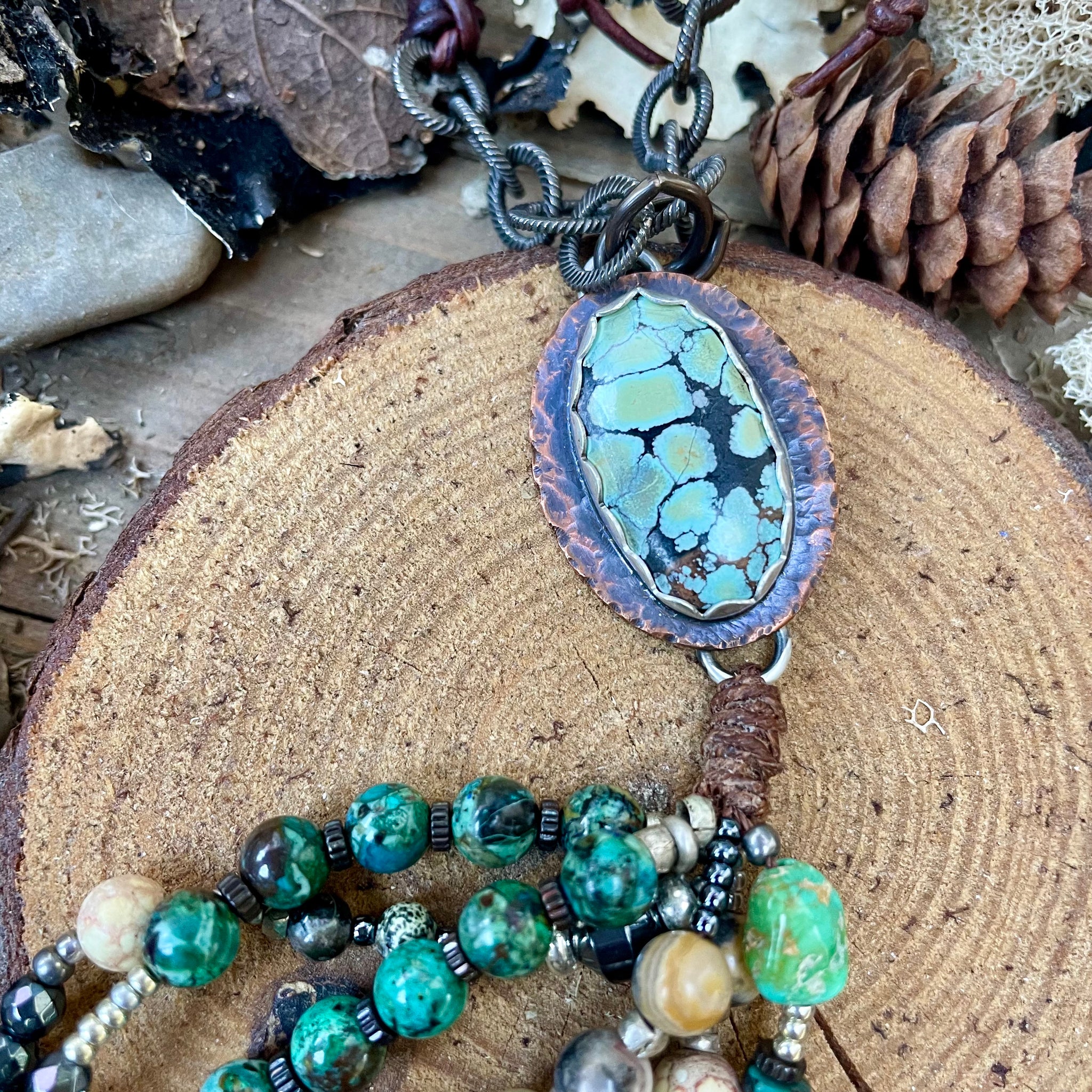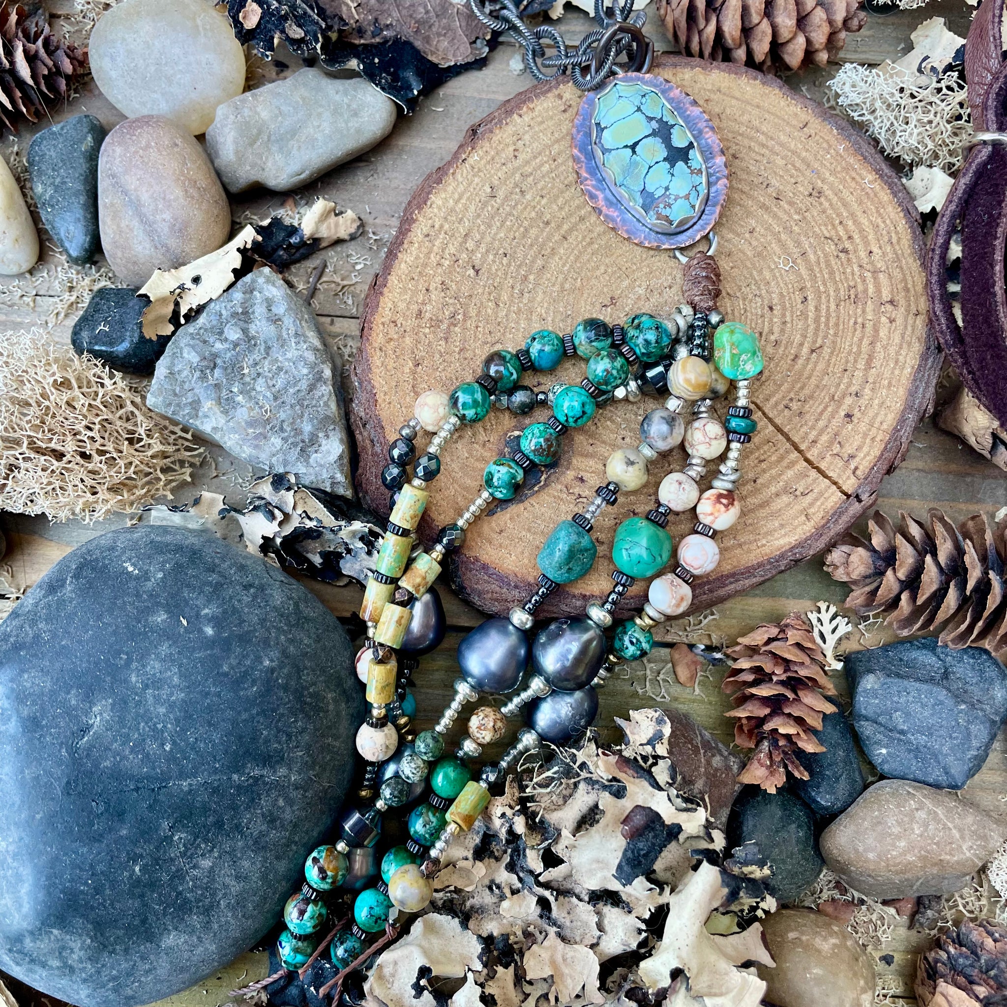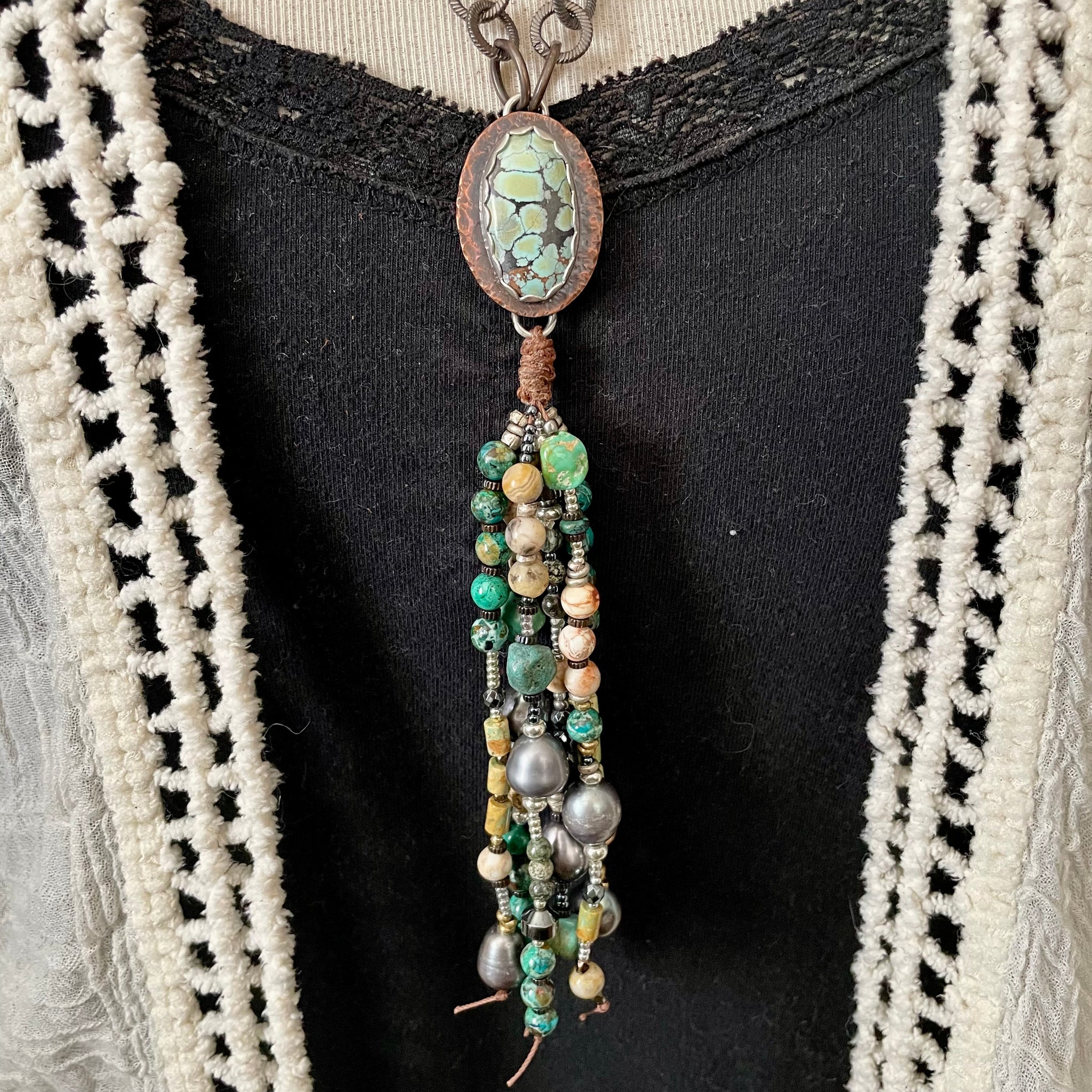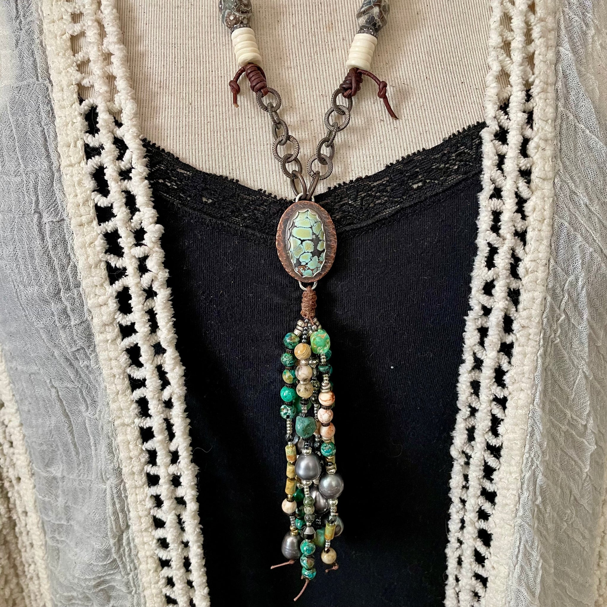 The pearls are super luminous, as are the gemstones. I’ve connected them to a custom sterling and Copper Bezeled turquoise connector, sterling silver chain links, with buttery dark brown leather and earthy bone. The length can be varied as it can be tied from a short length to long. It looks amazing on its own, or paired with other favorites.