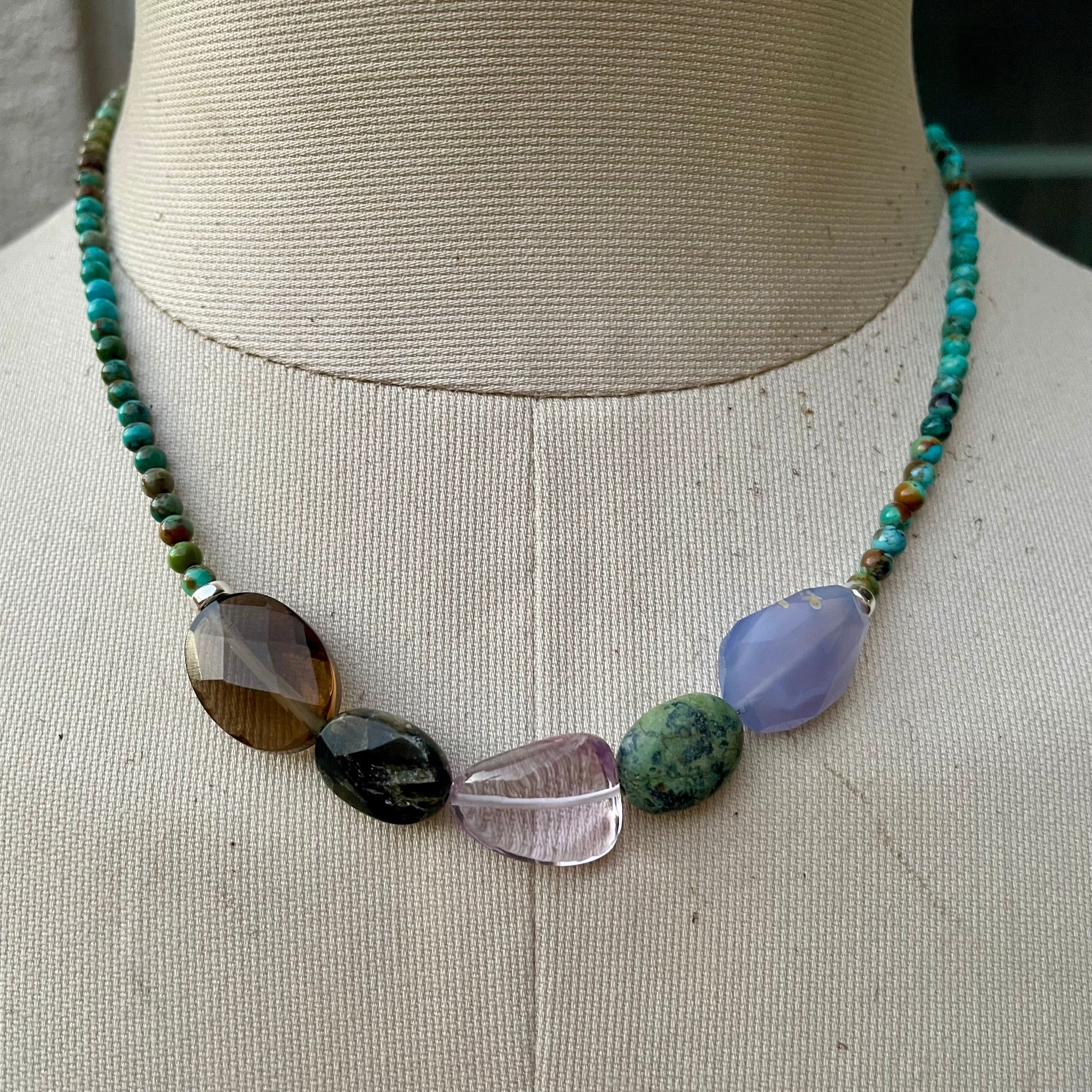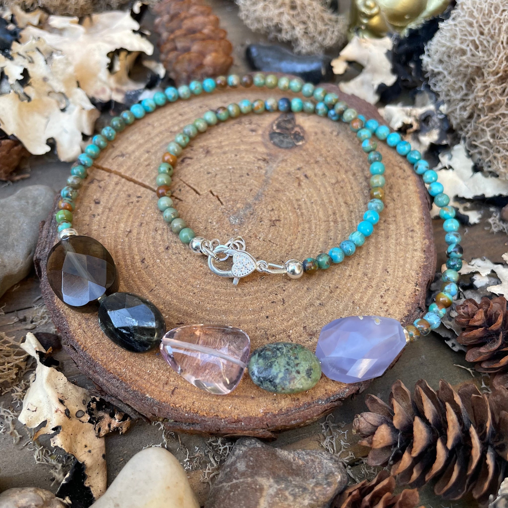 This one of a kind single strand necklace has been created with small 4mm natural Turquoise round beads, a couple sterling spacer beads, natural gemstone nuggets all connected to a tiny sterling heart lobster clasp with an extender. It’s a one of a kind necklace and is so easy to wear and pair with other pieces. It also looks great solo and hangs at about 18”.