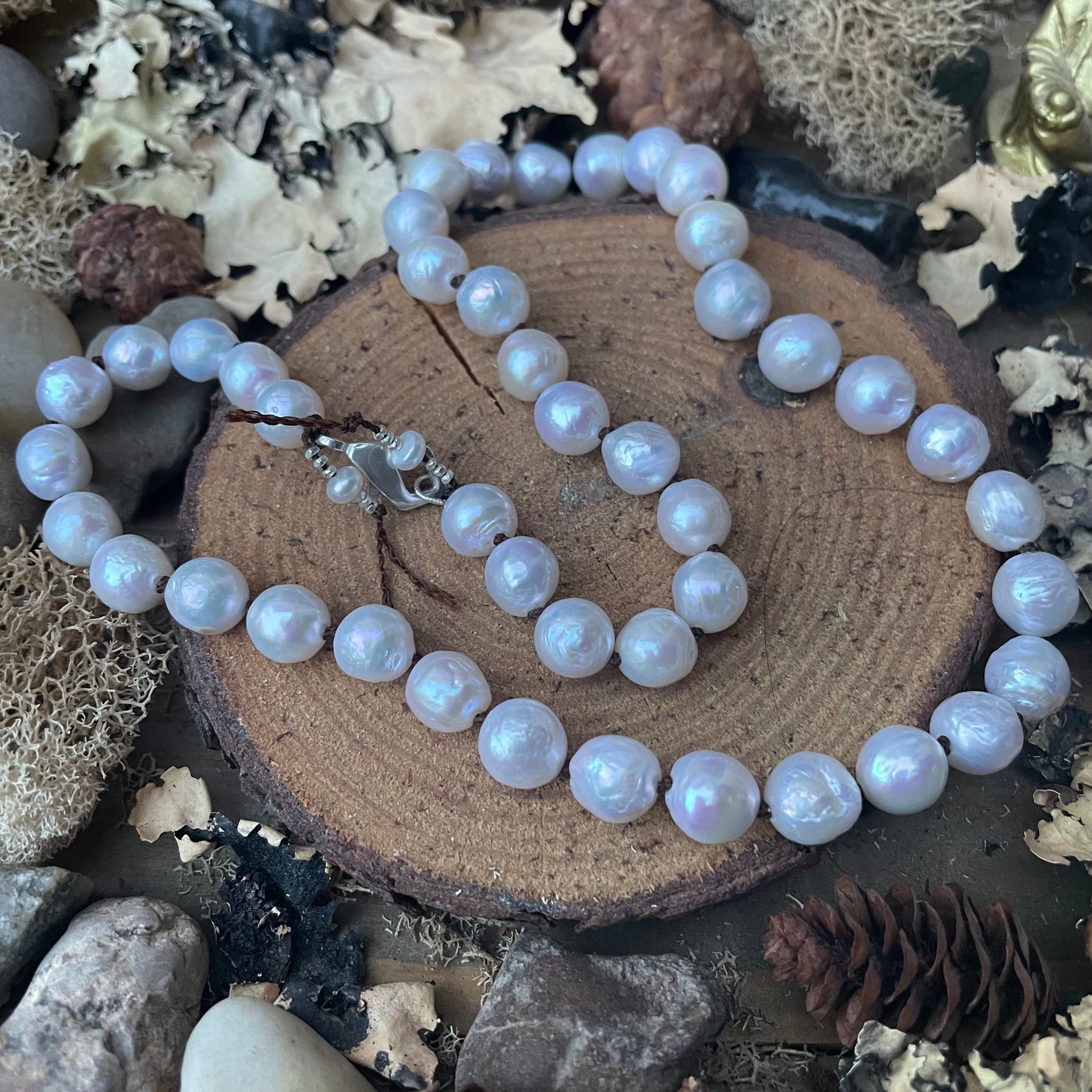 This single strand necklace has been created with super luminous natural wrinkled white Edison pearls on the smaller side 8-9mm flanked by tiny sterling silver beads, connected to a small sterling silver lobster closure. These lovely Edisons are so luminous, with a beautiful nacre! This piece can be worn with the clasp at the front with a dangling charm, on the side or clasp in back. It’s a one of a kind necklace and is so easy to wear and pair with other pieces. It looks great solo and hangs at about 17”.
