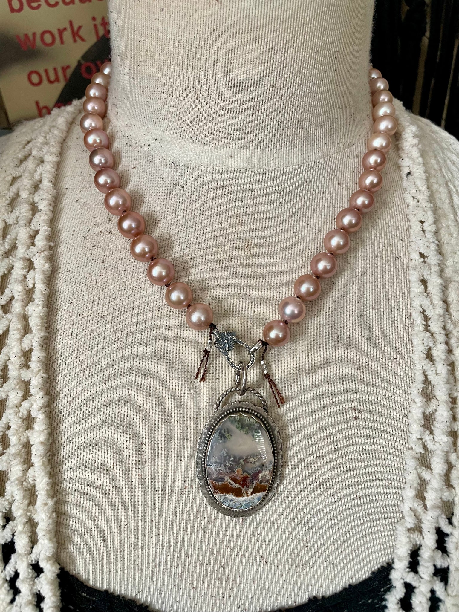 This single strand necklace has been created with super luminous natural high end pink Edison pearls on the smaller side 9-10mm flanked by tiny sterling silver beads, connected to a small floral sterling silver lobster closure. These lovely Edisons are so luminous in baby pink! This piece can be worn with the clasp at the front with a dangling pendant or charms, on the side or clasp in back. It’s a one of a kind necklace and is so easy to wear and pair with other pieces. It looks great solo and hangs at about 17”.